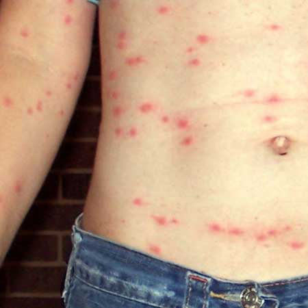 Укуси блохи викликають сильне свербіння. Зазвичай, блошині укуси з’являються групками по 3-4 крапки і нагадують дрібні червоні пухирці, на місці яких залишаються червоні цятки з отворами по центру.